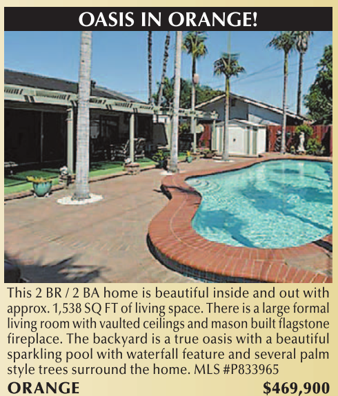 This 2 BR / 2 BA home is beautiful inside and out with approx. 1,538 SQ FT of living space. There is a large formal living room with vaulted ceilings and mason built flagstone fireplace. The backyard is a true oasis with a beautiful sparkling pool with waterfall feature and several palm style trees surround the home. MLS #P833965 ORANGE $469,900