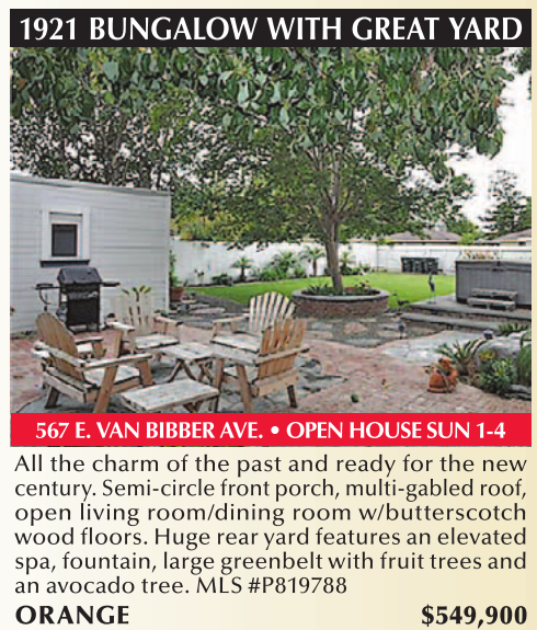 All the charm of the past and ready for the new century. Semi-circle front porch, multi-gabled roof, open living room/dining room w/butterscotch wood floors. Huge rear yard features an elevated spa, fountain, large greenbelt with fruit trees and an avocado tree. MLS #P819788 ORANGE $549,900