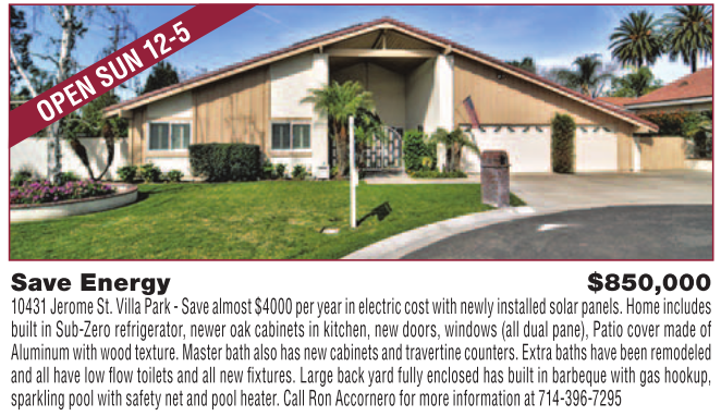 and all have low fl ow toilets and all new fi xtures. Large back yard fully enclosed has built in barbeque with gas hookup, sparkling pool with safety net and pool heater. Call Ron Accornero for more information at 714-396-7295
