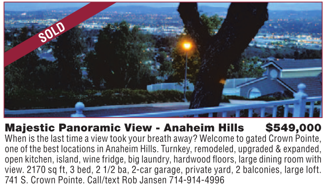 Majestic Panoramic View - Anaheim Hills $549,000 When is the last time a view took your breath away? Welcome to gated Crown Pointe, one of the best locations in Anaheim Hills. Turnkey, remodeled, upgraded & expanded, open kitchen, island, wine fridge, big laundry, hardwood floors, large dining room with view. 2170 sq ft, 3 bed, 2 1/2 ba, 2-car garage, private yard, 2 balconies, large loft. 741 S. Crown Pointe. Call/text Rob Jansen 714-914-4996