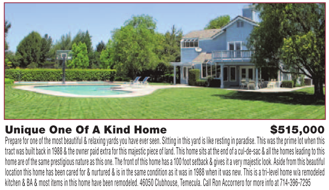 Unique One Of A Kind Home $515,000 Prepare for one of the most beautiful & relaxing yards you have ever seen. Sitting in this yard is like resting in paradise. This was the prime lot when this tract was built back in 1988 & the owner paid extra for this majestic piece of land. This home sits at the end of a cul-de-sac & all the homes leading to this home are of the same prestigious nature as this one. The front of this home has a 100 foot setback & gives it a very majestic look. Aside from this beautiful location this home has been cared for & nurtured & is in the same condition as it was in 1988 when it was new. This is a tri-level home w/a remodeled kitchen & BA & most items in this home have been remodeled. 46050 Clubhouse, Temecula. Call Ron Accornero for more info at 714-396-7295