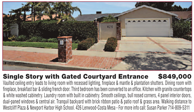 Single Story with Gated Courtyard Entrance $849,000 Vaulted ceiling entry leads to living room with recessed lighting, fi replace & mantle & plantation shutters. Dining room with fi replace, breakfast bar & sliding french door. Third bedroom has been converted to an offi ce. Kitchen with granite countertops & white washed cabinetry. Laundry room with built in cabinetry. Smooth ceilings, bull nosed corners, 4 panel interior doors, dual-paned windows & central air. Tranquil backyard with brick ribbon patio & patio roof & grass area. Walking distance to Westcliff Plaza & Newport Harbor High School. 426 Lenwood-Costa Mesa - For more info call: Susan Parker 714-809-5311