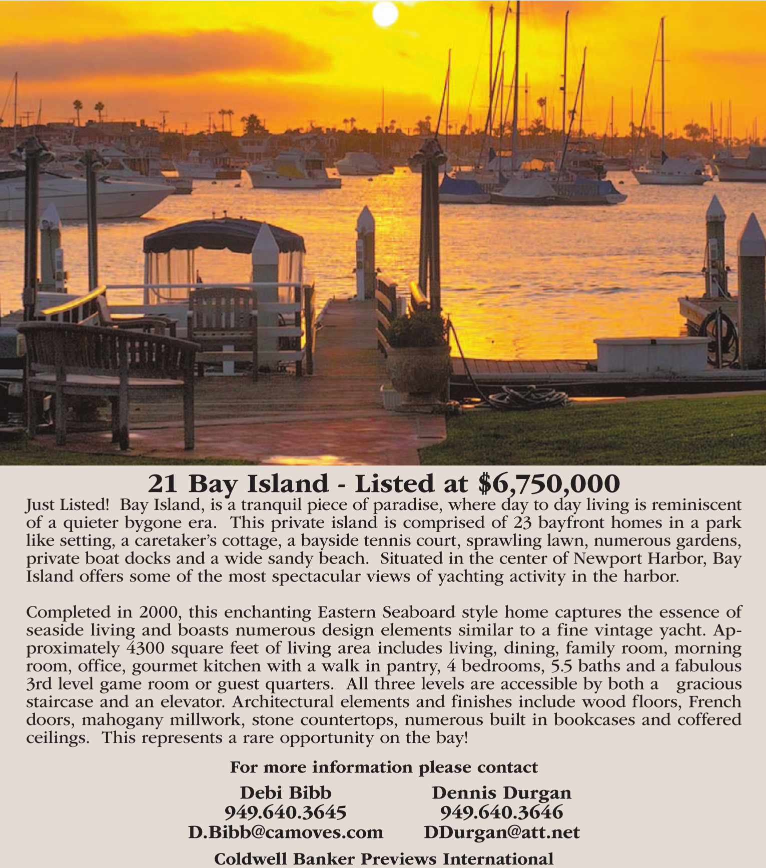 21 Bay Island - Listed at $6,750,000 Just Listed! Bay Island, is a tranquil piece of paradise, where day to day living is reminiscent of a quieter bygone era. This private island is comprised of 23 bayfront homes in a park like setting, a caretaker’s cottage, a bayside tennis court, sprawling lawn, numerous gardens, private boat docks and a wide sandy beach. Situated in the center of Newport Harbor, Bay Island offers some of the most spectacular views of yachting activity in the harbor. Completed in 2000, this enchanting Eastern Seaboard style home captures the essence of seaside living and boasts numerous design elements similar to a fine vintage yacht. Approximately 4300 square feet of living area includes living, dining, family room, morning room, office, gourmet kitchen with a walk in pantry, 4 bedrooms, 5.5 baths and a fabulous 3rd level game room or guest quarters. All three levels are accessible by both a gracious staircase and an elevator. Architectural elements and finishes include wood floors, French doors, mahogany millwork, stone countertops, numerous built in bookcases and coffered ceilings. This represents a rare opportunity on the bay! For more information please contact Debi Bibb 949.640.3645 D.Bibb@camoves.com Dennis Durgan 949.640.3646 DDurgan@att.net Coldwell Banker Previews International
