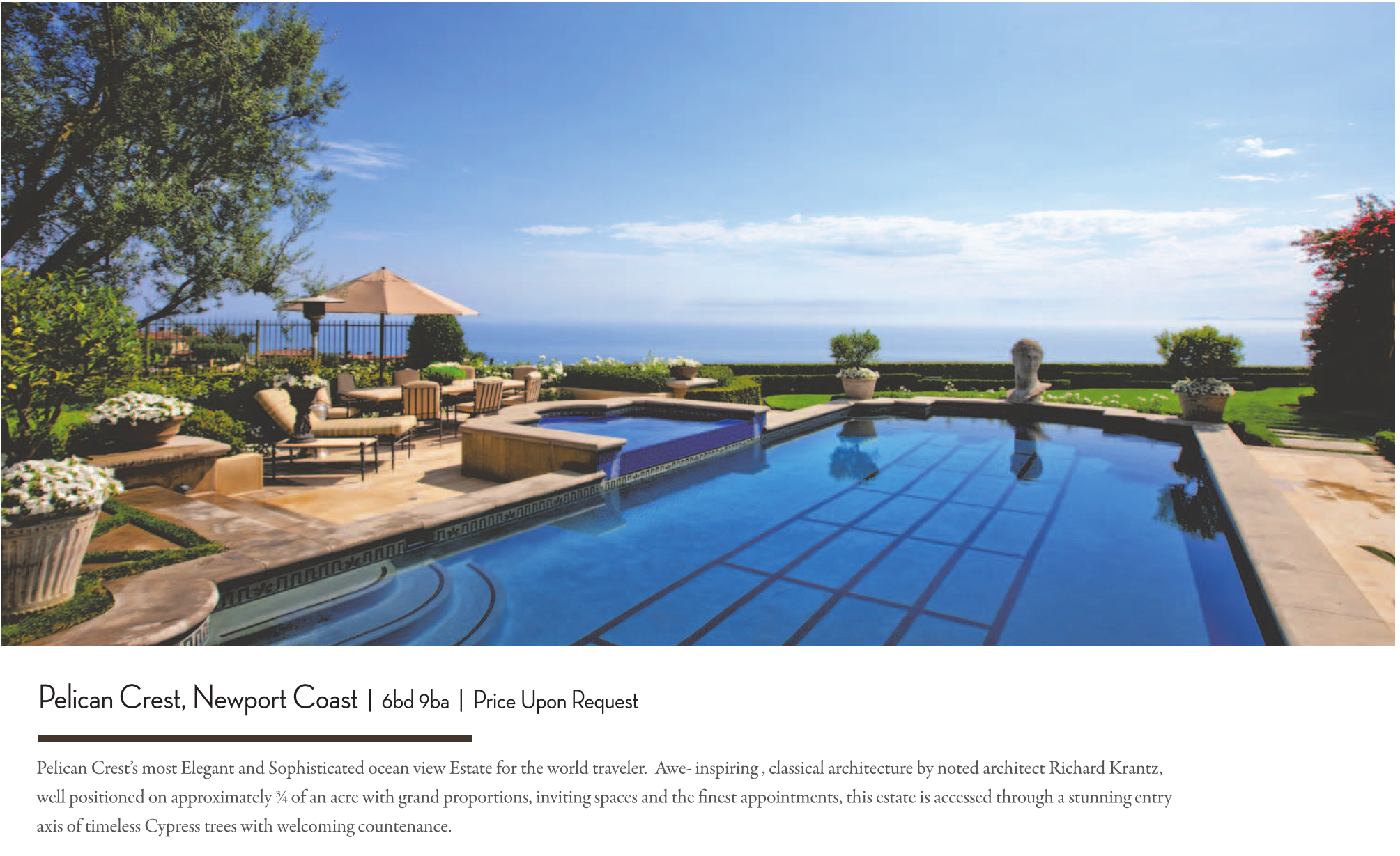 Pelican Crest’s most Elegant and Sophisticated ocean view Estate for the world traveler. Awe- inspiring , classical architecture by noted architect Richard Krantz, well positioned on approximately ¾ of an acre with grand proportions, inviting spaces and the finest appointments, this estate is accessed through a stunning entry axis of timeless Cypress trees with welcoming countenance.