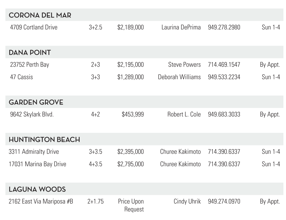 CORONA DEL MAR 4709 Cortland Drive 3+2.5 $2,189,000 Laurina DePrima 949.278.2980 Sun 1-4 DANA POINT 23752 Perth Bay 2+3 $2,195,000 Steve Powers 714.469.1547 By Appt. 47 Cassis 3+3 $1,289,000 Deborah Williams 949.533.2234 Sun 1-4 GARDEN GROVE 9642 Skylark Blvd. 4+2 $453,999 Robert L. Cole 949.683.3033 By Appt. HUNTINGTON BEACH 3311 Admiralty Drive 3+3.5 $2,395,000 Churee Kakimoto 714.390.6337 Sun 1-4 17031 Marina Bay Drive 4+3.5 $2,795,000 Churee Kakimoto 714.390.6337 Sun 1-4 GUNA WOODS 2162 East Via Mariposa #B 2+1.75 Price Upon Request Cindy Uhrik 949.274.0970 By Appt. See also