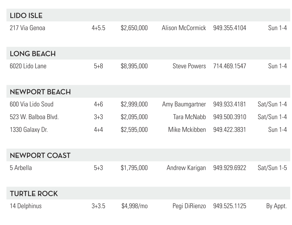 NEWPORT BEACH 600 Via Lido Soud 4+6 $2,999,000 Amy Baumgartner 949.933.4181 Sat/Sun 1-4 523 W. Balboa Blvd. 3+3 $2,095,000 Tara McNabb 949.500.3910 Sat/Sun 1-4 1330 Galaxy Dr. 4+4 $2,595,000 Mike Mckibben 949.422.3831 Sun 1-4