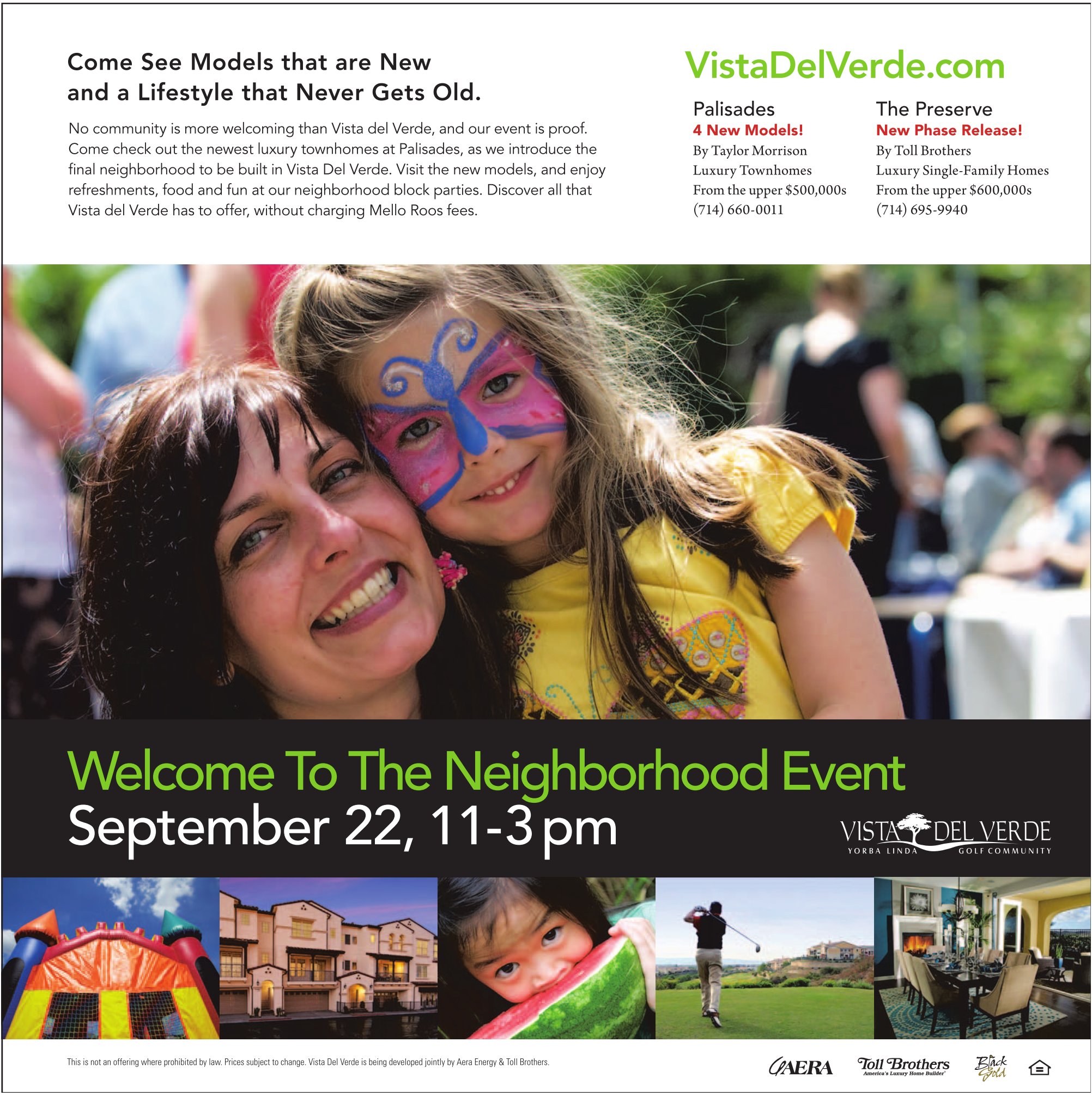 Come See Models that are New and a Lifestyle that Never Gets Old. No community is more welcoming than Vista del Verde, and our event is proof. Come check out the newest luxury townhomes at Palisades, as we introduce the final neighborhood to be built in Vista Del Verde. Visit the new models, and enjoy refreshments, food and fun at our neighborhood block parties. Discover all that Vista del Verde has to offer, without charging Mello Roos fees. VistaDelVerde.com Palisades 4 New Models! By Taylor Morrison Luxury Townhomes From the upper $500,000s (714) 660-0011 The Preserve New Phase Release! By Toll Brothers Luxury Single-Family Homes From the upper $600,000s (714) 695-9940 Welcome To The Neighborhood Event September 22, 11- 3 pm This is not an offering where prohibited by law. Prices subject to change. Vista Del Verde is being developed jointly by Aera Energy & Toll Brothers.