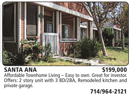 SANTA ANA $199,000 Affordable Townhome Living – Easy to own. Great for investor. Offers: 2 story unit with 3 BD/2BA, Remodeled kitchen and private garage.