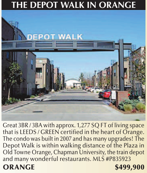 THE DEPOT WALK IN ORANGE Great 3BR / 3BA with approx. 1,277 SQ FT of living space that is LEEDS / GREEN certified in the heart of Orange. The condo was built in 2007 and has many upgrades! The Depot Walk is within walking distance of the Plaza in Old Towne Orange, Chapman University, the train depot and many wonderful restaurants. MLS #P835923 ORANGE $499,900