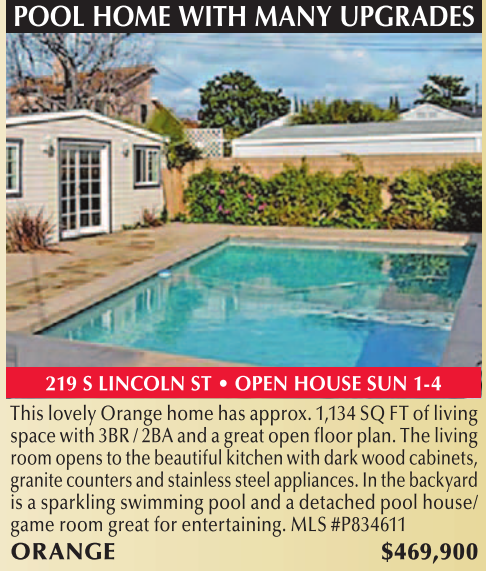 POOL HOME WITH MANY UPGRADES 219 S LINCOLN ST • OPEN HOUSE SUN 1-4 This lovely Orange home has approx. 1,134 SQ FT of living space with 3BR / 2BA and a great open floor plan. The living room opens to the beautiful kitchen with dark wood cabinets, granite counters and stainless steel appliances. In the backyard is a sparkling swimming pool and a detached pool house/ game room great for entertaining. MLS #P834611 ORANGE $469,900