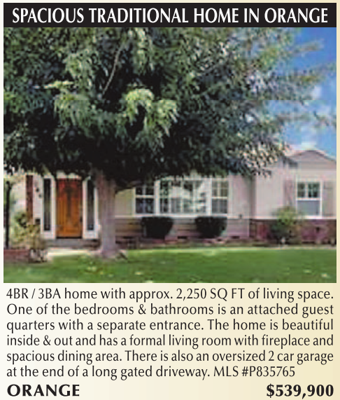 4BR / 3BA home with approx. 2,250 SQ FT of living space. One of the bedrooms & bathrooms is an attached guest quarters with a separate entrance. The home is beautiful inside & out and has a formal living room with fireplace and spacious dining area. There is also an oversized 2 car garage at the end of a long gated driveway. MLS #P835765 ORANGE $539,900