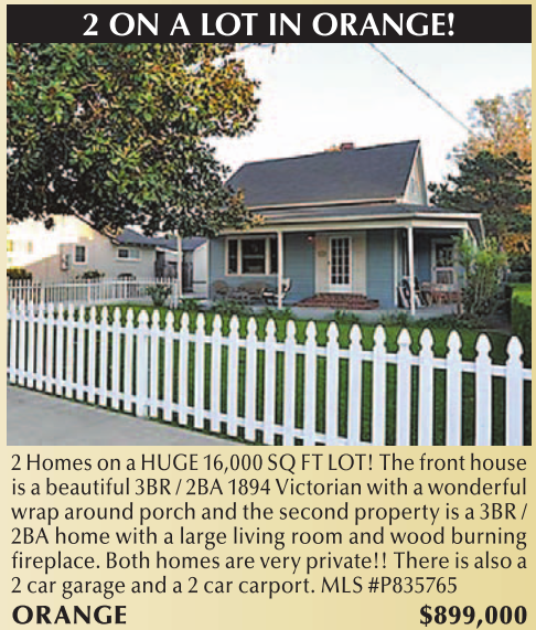 2 Homes on a HUGE 16,000 SQ FT LOT! The front house is a beautiful 3BR / 2BA 1894 Victorian with a wonderful wrap around porch and the second property is a 3BR / 2BA home with a large living room and wood burning fireplace. Both homes are very private!! There is also a 2 car garage and a 2 car carport. MLS #P835765 ORANGE $899,000