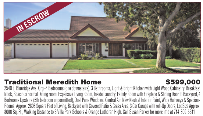 Traditional Meredith Home $599,000 2540 E. Blueridge Ave. Org -4 Bedrooms (one downstairs), 3 Bathrooms, Light & Bright Kitchen with Light Wood Cabinetry, Breakfast Nook, Spacious Formal Dining room, Expansive Living Room, Inside Laundry, Family Room with Fireplace & Sliding Door to Backyard, 4 Bedrooms Upstairs (5th bedroom unpermitted), Dual Pane Windows, Central Air, New Neutral Interior Paint, Wide Hallways & Spacious Rooms, Approx. 2808 Square Feet of Living, Backyard with Covered Patio & Grass Area, 3 Car Garage with roll-Up Doors, Lot Size Approx. 8000 Sq. Ft., Walking Distance to 3 Villa Park Schools & Orange Lutheran High. Call Susan Parker for more info at 714-809-5311