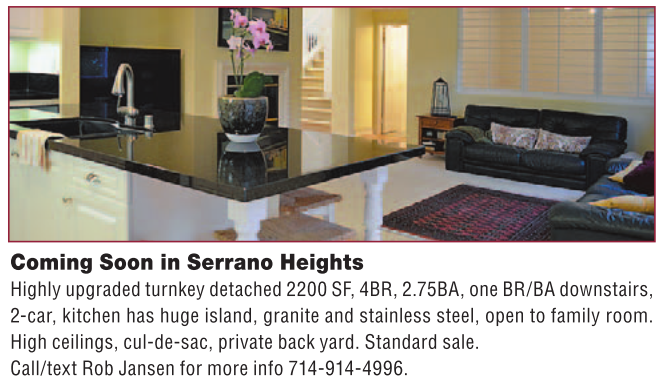 Coming Soon in Serrano Heights Highly upgraded turnkey detached 2200 SF, 4BR, 2.75BA, one BR/BA downstairs, 2-car, kitchen has huge island, granite and stainless steel, open to family room. High ceilings, cul-de-sac, private back yard. Standard sale. Call/text Rob Jansen for more info 714-914-4996.