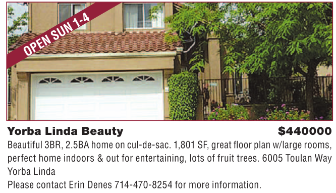 Yorba Linda Beauty $440000 Beautiful 3BR, 2.5BA home on cul-de-sac. 1,801 SF, great fl oor plan w/large rooms, perfect home indoors & out for entertaining, lots of fruit trees. 6005 Toulan Way Yorba Linda Please contact Erin Denes 714-470-8254 for more information.