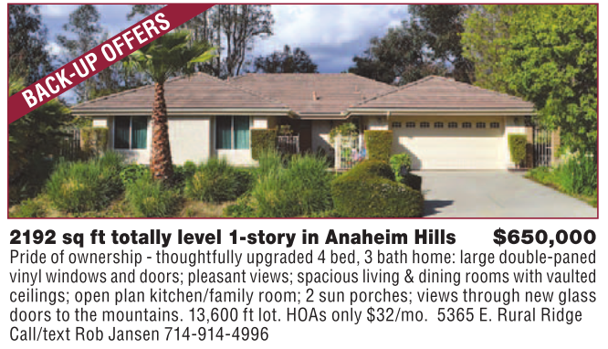 2192 sq ft totally level 1-story in Anaheim Hills $650,000 Pride of ownership - thoughtfully upgraded 4 bed, 3 bath home: large double-paned vinyl windows and doors; pleasant views; spacious living & dining rooms with vaulted ceilings; open plan kitchen/family room; 2 sun porches; views through new glass doors to the mountains. 13,600 ft lot. HOAs only $32/mo. 5365 E. Rural Ridge Call/text Rob Jansen 714-914-4996
