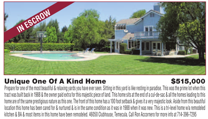 Unique One Of A Kind Home $515,000 Prepare for one of the most beautiful & relaxing yards you have ever seen. Sitting in this yard is like resting in paradise. This was the prime lot when this tract was built back in 1988 & the owner paid extra for this majestic piece of land. This home sits at the end of a cul-de-sac & all the homes leading to this home are of the same prestigious nature as this one. The front of this home has a 100 foot setback & gives it a very majestic look. Aside from this beautiful location this home has been cared for & nurtured & is in the same condition as it was in 1988 when it was new. This is a tri-level home w/a remodeled kitchen & BA & most items in this home have been remodeled. 46050 Clubhouse, Temecula. Call Ron Accornero for more info at 714-396-7295