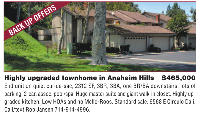 Highly upgraded townhome in Anaheim Hills $465,000 End unit on quiet cul-de-sac, 2312 SF, 3BR, 3BA, one BR/BA downstairs, lots of parking, 2-car, assoc. pool/spa. Huge master suite and giant walk-in closet. Highly upgraded kitchen. Low HOAs and no Mello-Roos. Standard sale. 6568 E Circulo Dali.