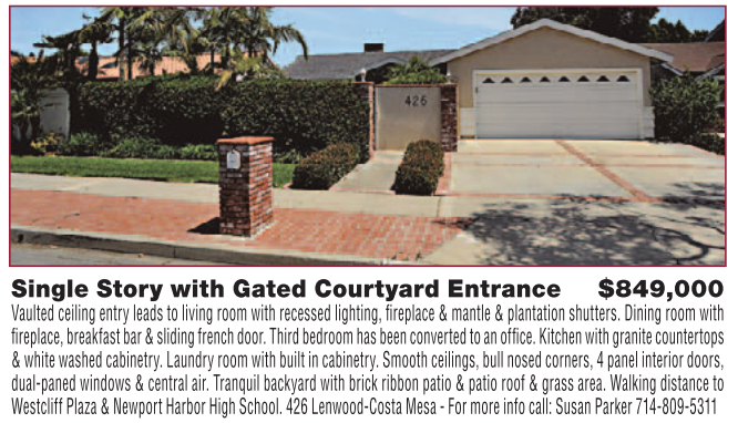 Single Story with Gated Courtyard Entrance $849,000 Vaulted ceiling entry leads to living room with recessed lighting, fi replace & mantle & plantation shutters. Dining room with fi replace, breakfast bar & sliding french door. Third bedroom has been converted to an offi ce. Kitchen with granite countertops & white washed cabinetry. Laundry room with built in cabinetry. Smooth ceilings, bull nosed corners, 4 panel interior doors, dual-paned windows & central air. Tranquil backyard with brick ribbon patio & patio roof & grass area. Walking distance to Westcliff Plaza & Newport Harbor High School. 426 Lenwood-Costa Mesa - For more info call: Susan Parker 714-809-5311