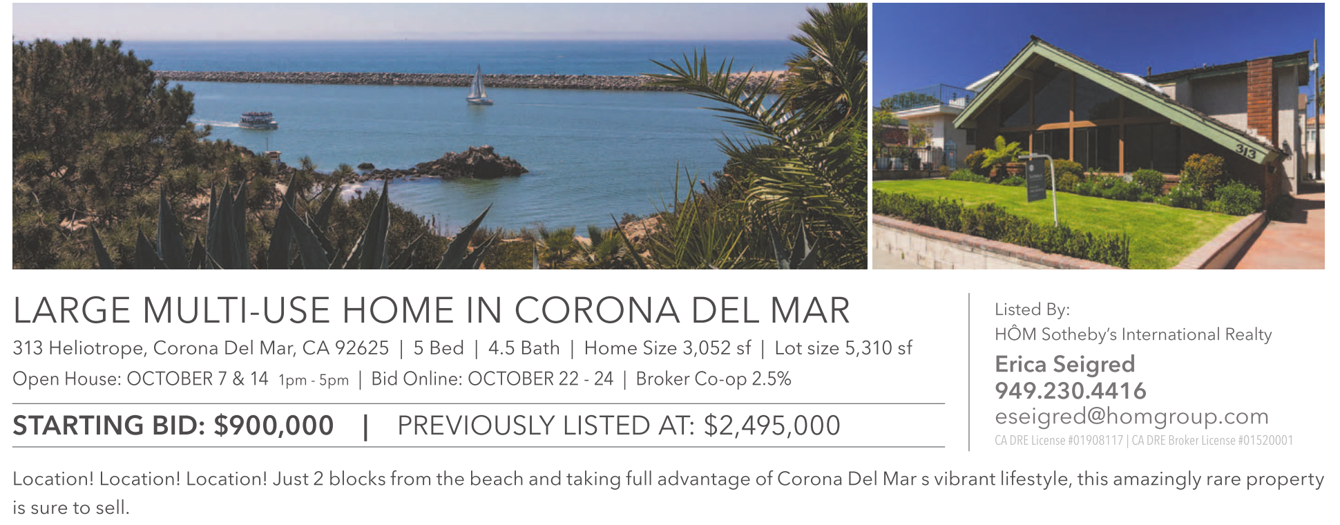 313 Heliotrope, Corona Del Mar, CA 92625 | 5 Bed | 4.5 Bath | Home Size 3,052 sf | Lot size 5,310 sf Open House: OCTOBER 7 & 14 1pm - 5pm | Bid Online: OCTOBER 22 - 24 | Broker Co-op 2.5%
