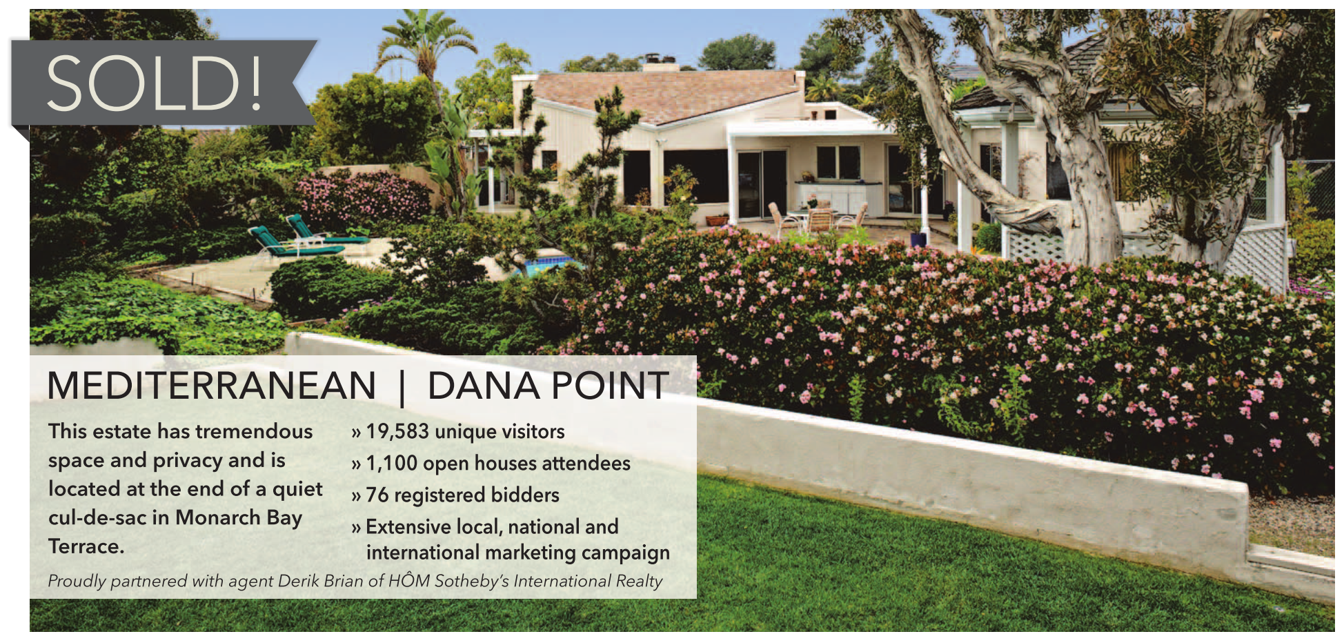 » 19,583 unique visitors » 1,100 open houses attendees » 76 registered bidders » Extensive local, national and international marketing campaign