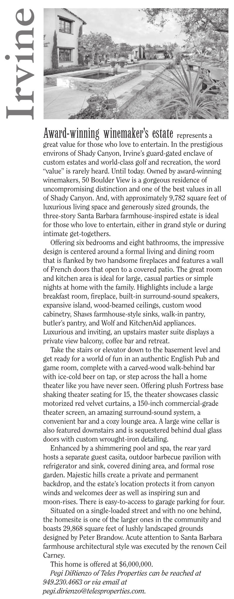 environs of Shady Canyon, Irvine’s guard-gated enclave of custom estates and world-class golf and recreation, the word “value” is rarely heard. Until today. Owned by award-winning winemakers, 50 Boulder View is a gorgeous residence of uncompromising distinction and one of the best values in all of Shady Canyon. And, with approximately 9,782 square feet of luxurious living space and generously sized grounds, the three-story Santa Barbara farmhouse-inspired estate is ideal for those who love to entertain, either in grand style or during intimate get-togethers.