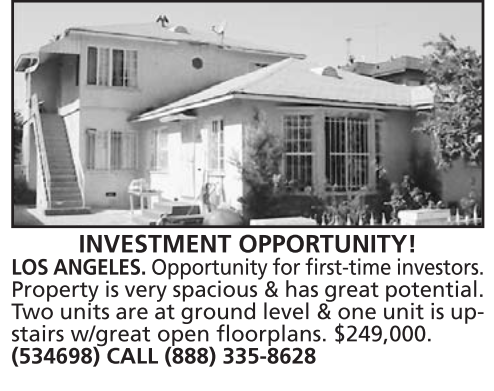 LOS ANGELES. Opportunity for first-time investors. Property is very spacious & has great potential. Two units are at ground level & one unit is upstairs w/great open floorplans. $249,000.