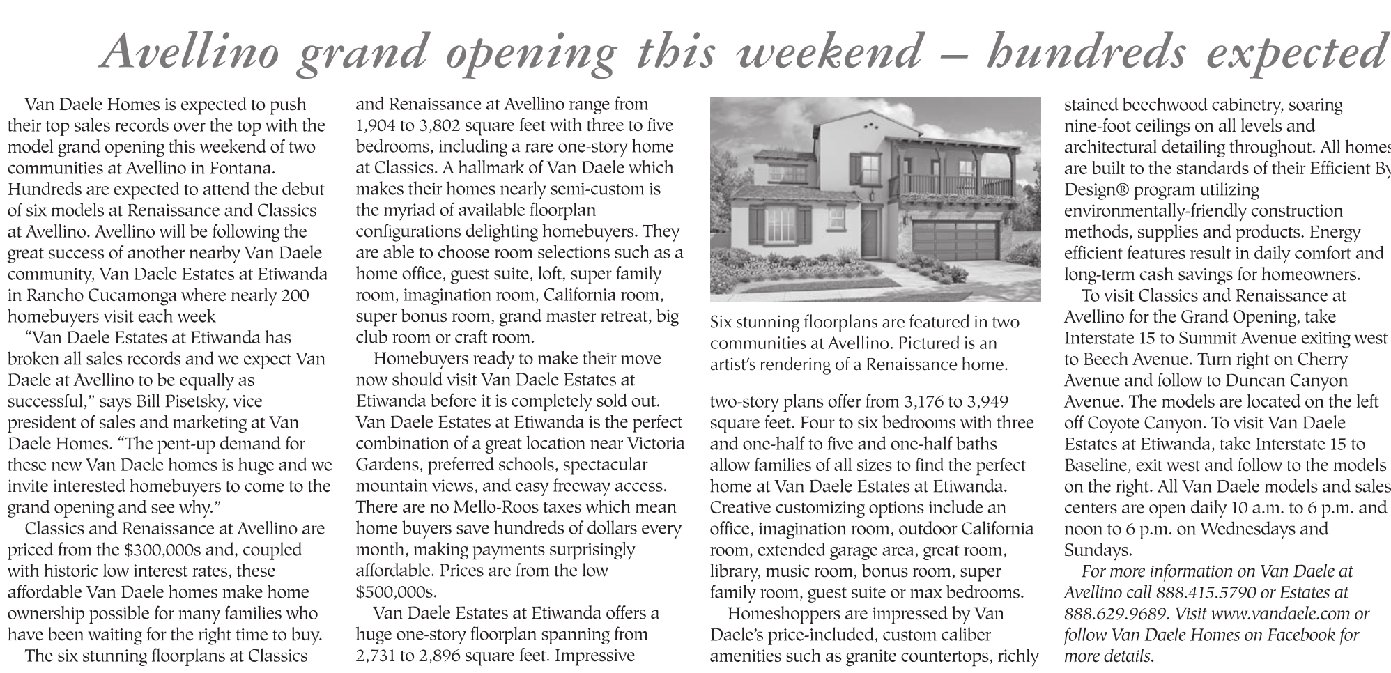 Van Daele Homes is expected to push their top sales records over the top with the model grand opening this weekend of two communities at Avellino in Fontana. Hundreds are expected to attend the debut of six models at Renaissance and Classics at Avellino. Avellino will be following the great success of another nearby Van Daele community, Van Daele Estates at Etiwanda in Rancho Cucamonga where nearly 200 homebuyers visit each week “Van Daele Estates at Etiwanda has broken all sales records and we expect Van Daele at Avellino to be equally as successful,” says Bill Pisetsky, vice president of sales and marketing at Van Daele Homes. “The pent-up demand for these new Van Daele homes is huge and we invite interested homebuyers to come to the grand opening and see why.”