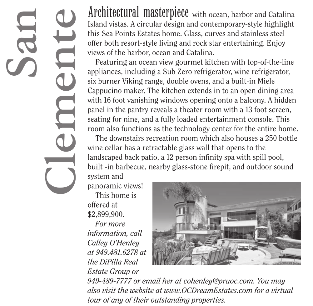 Architectural masterpiece with ocean, harbor and Catalina Island vistas. A circular design and contemporary-style highlight this Sea Points Estates home. Glass, curves and stainless steel offer both resort-style living and rock star entertaining. Enjoy views of the harbor, ocean and Catalina. Featuring an ocean view gourmet kitchen with top-of-the-line appliances, including a Sub Zero refrigerator, wine refrigerator, six burner Viking range, double ovens, and a built-in Miele Cappucino maker. The kitchen extends in to an open dining area with 16 foot vanishing windows opening onto a balcony. A hidden panel in the pantry reveals a theater room with a 13 foot screen, seating for nine, and a fully loaded entertainment console. This room also functions as the technology center for the entire home. The downstairs recreation room which also houses a 250 bottle wine cellar has a retractable glass wall that opens to the landscaped back patio, a 12 person infinity spa with spill pool, built -in barbecue, nearby glass-stone firepit, and outdoor sound system and panoramic views! This home is offered at $2,899,900. For more information, call Calley O’Henley at 949.481.6278 at the DiPilla Real Estate Group or 949-489-7777 or email her at cohenley@pruoc.com. You may also visit the website at www.OCDreamEstates.com for a virtual tour of any of their outstanding properties.