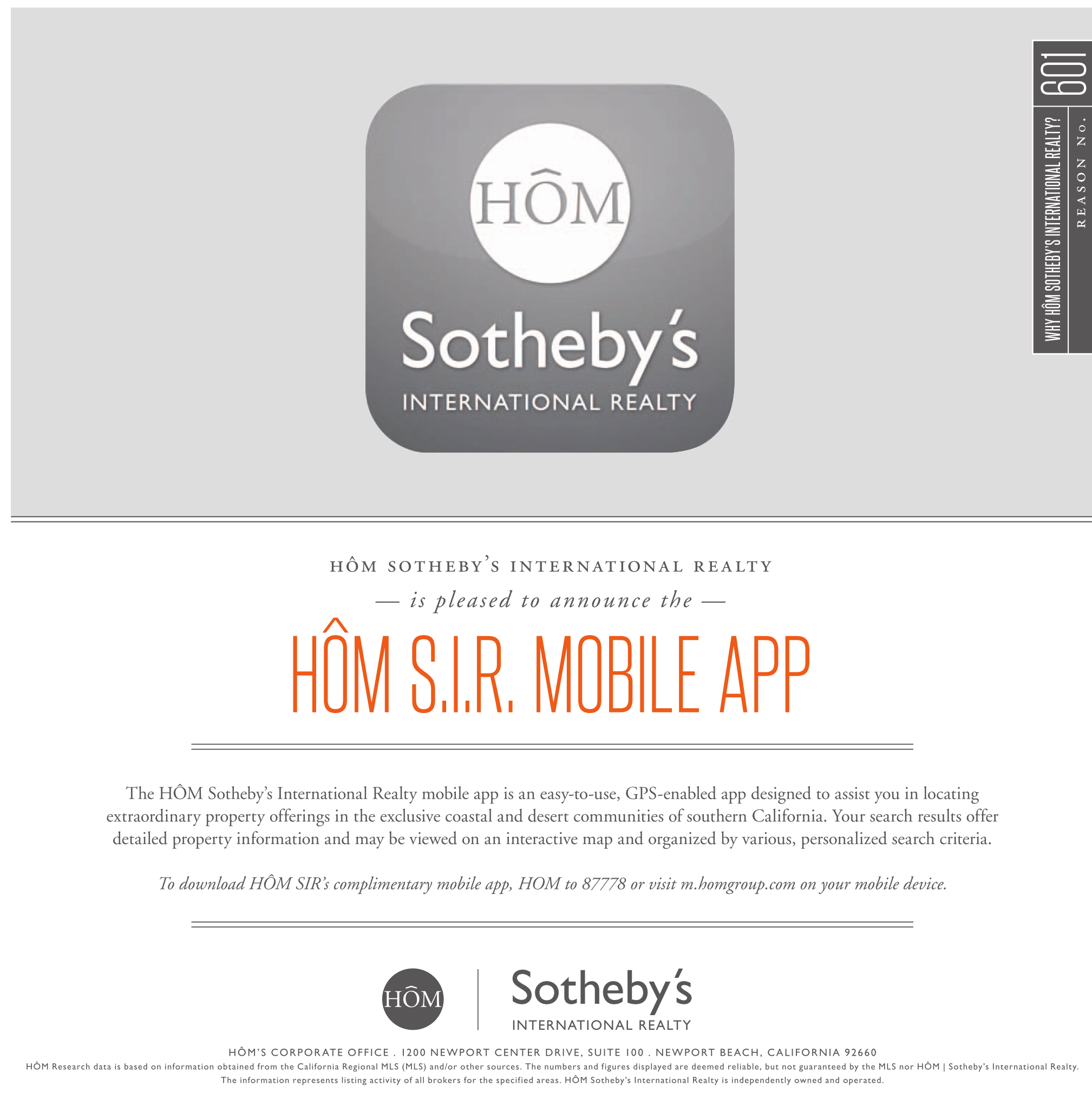 The HÔM Sotheby’s International Realty mobile app is an easy-to-use, GPS-enabled app designed to assist you in locating extraordinary property offerings in the exclusive coastal and desert communities of southern California. Your search results offer detailed property information and may be viewed on an interactive map and organized by various, personalized search criteria.
