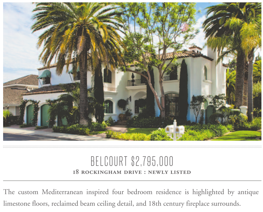 The custom Mediterranean inspired four bedroom residence is highlighted by antique limestone floors, reclaimed beam ceiling detail, and 18th century fireplace surrounds.