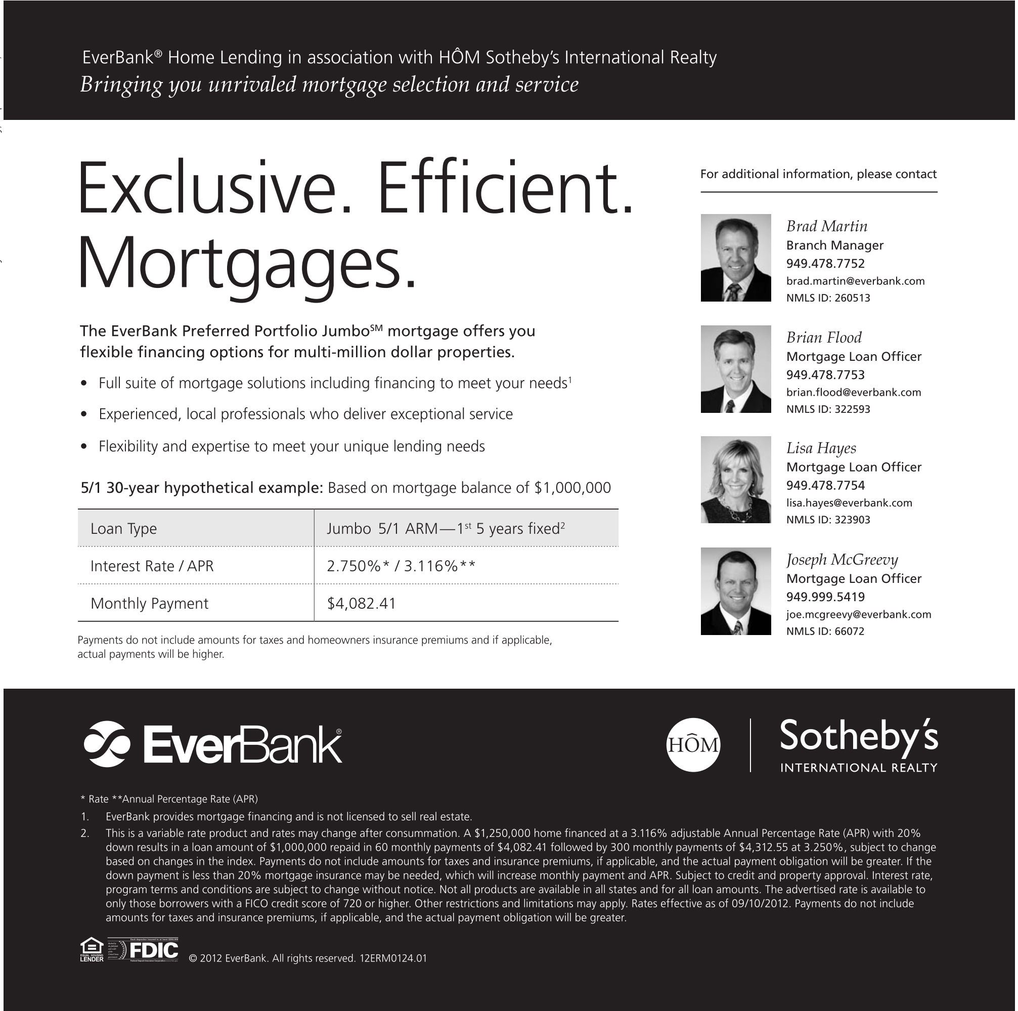 * Rate **Annual Percentage Rate (APR) 1. EverBank provides mortgage financing and is not licensed to sell real estate. 2. This is a variable rate product and rates may change after consummation. A $1,250,000 home financed at a 3.116% adjustable Annual Percentage Rate (APR) with 20% down results in a loan amount of $1,000,000 repaid in 60 monthly payments of $4,082.41 followed by 300 monthly payments of $4,312.55 at 3.250%, subject to change based on changes in the index. Payments do not include amounts for taxes and insurance premiums, if applicable, and the actual payment obligation will be greater. If the down payment is less than 20% mortgage insurance may be needed, which will increase monthly payment and APR. Subject to credit and property approval. Interest rate, program terms and conditions are subject to change without notice. Not all products are available in all states and for all loan amounts. The advertised rate is available to only those borrowers with a FICO credit score of 720 or higher. Other restrictions and limitations may apply. Rates effective as of 09/10/2012. Payments do not include amounts for taxes and insurance premiums, if applicable, and the actual payment obligation will be greater.