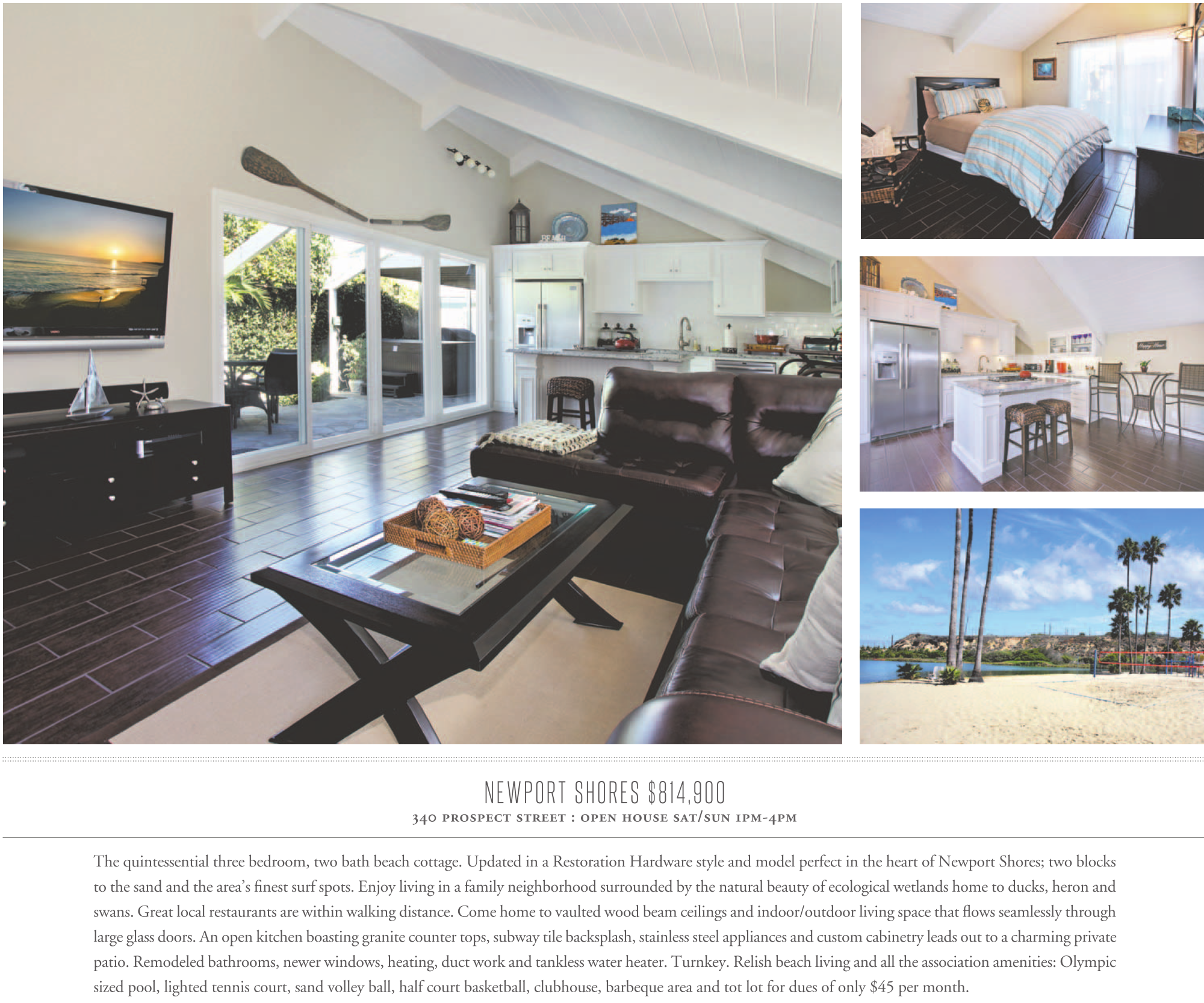 The quintessential three bedroom, two bath beach cottage. Updated in a Restoration Hardware style and model perfect in the heart of Newport Shores; two blocks to the sand and the area’s finest surf spots. Enjoy living in a family neighborhood surrounded by the natural beauty of ecological wetlands home to ducks, heron and swans. Great local restaurants are within walking distance. Come home to vaulted wood beam ceilings and indoor/outdoor living space that flows seamlessly through large glass doors. An open kitchen boasting granite counter tops, subway tile backsplash, stainless steel appliances and custom cabinetry leads out to a charming private patio. Remodeled bathrooms, newer windows, heating, duct work and tankless water heater. Turnkey. Relish beach living and all the association amenities: Olympic sized pool, lighted tennis court, sand volley ball, half court basketball, clubhouse, barbeque area and tot lot for dues of only $45 per month.