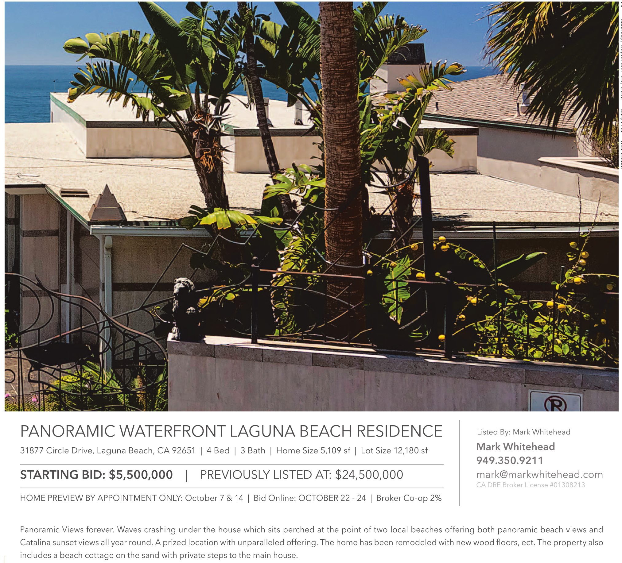 11 PANORAMIC WATERFRONT LAGUNA BEACH RESIDENCE 31877 Circle Drive, Laguna Beach, CA 92651 | 4 Bed | 3 Bath | Home Size 5,109 sf | Lot Size 12,180 sf STARTING BID: $5,500,000 | PREVIOUSLY LISTED AT: $24,500,000 HOME PREVIEW BY APPOINTMENT ONLY: October 7 & 14 | Bid Online: OCTOBER 22 - 24 | Broker Co-op 2% Listed By: Mark Whitehead Mark Whitehead 949.350.9211 mark@markwhitehead.com CA DRE Broker License #01308213 Panoramic Views forever. Waves crashing under the house which sits perched at the point of two local beaches offering both panoramic beach views and Catalina sunset views all year round. A prized location with unparalleled offering. The home has been remodeled with new wood floors, ect. The property also includes a beach cottage on the sand with private steps to the main house.