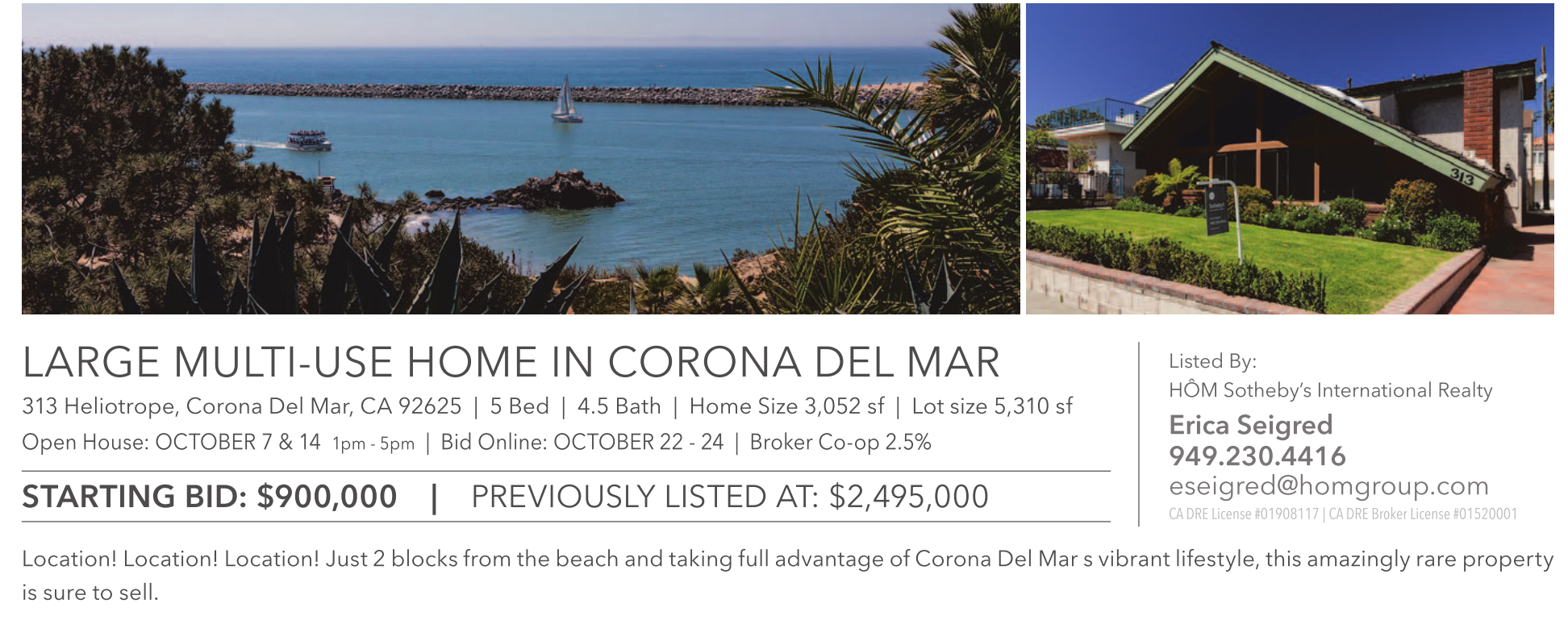 LARGE MULTI-USE HOME IN CORONA DEL MAR 313 Heliotrope, Corona Del Mar, CA 92625 | 5 Bed | 4.5 Bath | Home Size 3,052 sf | Lot size 5,310 sf Open House: OCTOBER 7 & 14 1pm - 5pm | Bid Online: OCTOBER 22 - 24 | Broker Co-op 2.5% STARTING BID: $900,000 | PREVIOUSLY LISTED AT: $2,495,000 Listed By: HÔM Sotheby’s International Realty Erica Seigred 949.230.4416 eseigred@homgroup.com CA DRE License #01908117 | CA DRE Broker License #01520001 Location! Location! Location! Just 2 blocks from the beach and taking full advantage of Corona Del Mar s vibrant lifestyle, this amazingly rare property is sure to sell.