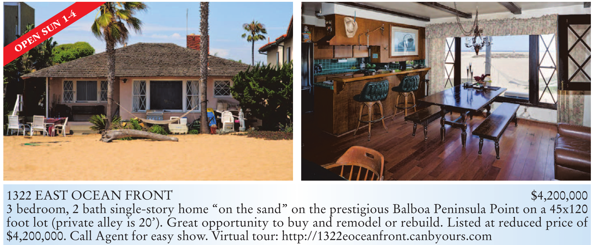 1322 EAST OCEAN FRONT $4,200,000 3 bedroom, 2 bath single-story home “on the sand” on the prestigious Balboa Peninsula Point on a 45x120 foot lot (private alley is 20’). Great opportunity to buy and remodel or rebuild. Listed at reduced price of $4,200,000. Call Agent for easy show. Virtual tour: http://1322eoceanfront.canbyours.com