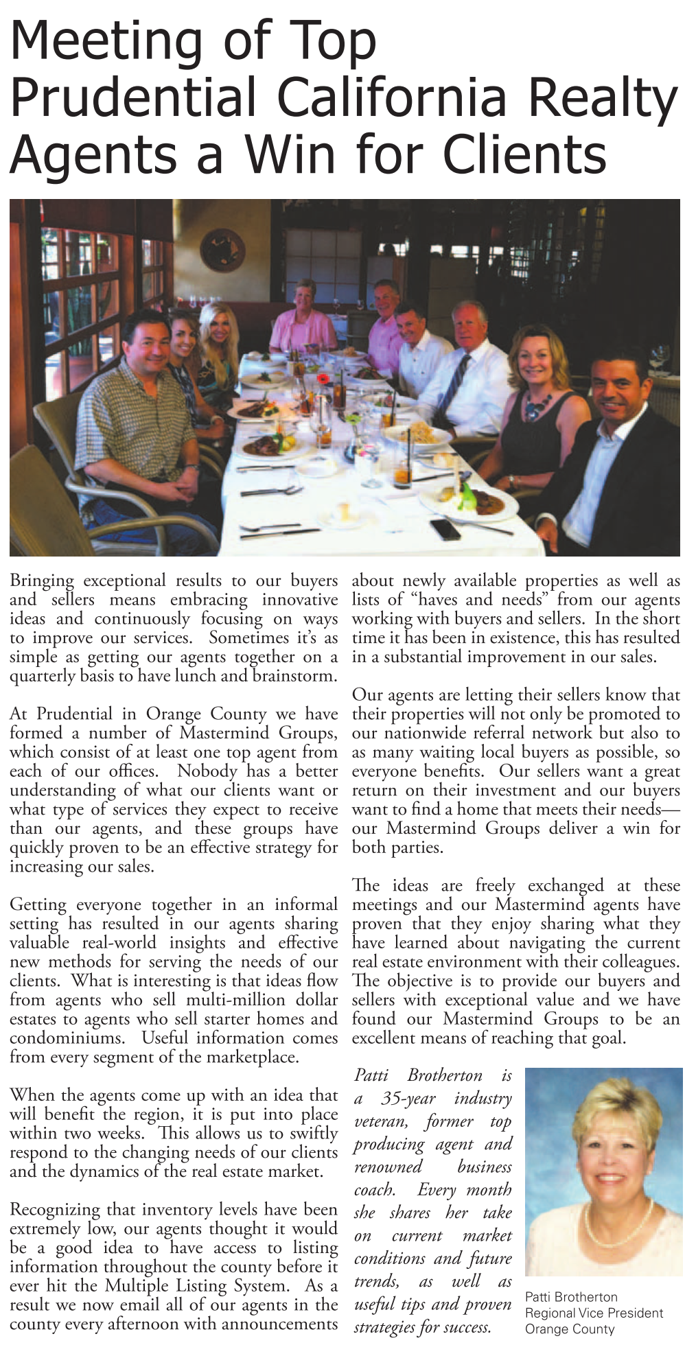 At Prudential in Orange County we have formed a number of Mastermind Groups, which consist of at least one top agent from each of our offices. Nobody has a better understanding of what our clients want or what type of services they expect to receive than our agents, and these groups have quickly proven to be an effective strategy for increasing our sales.