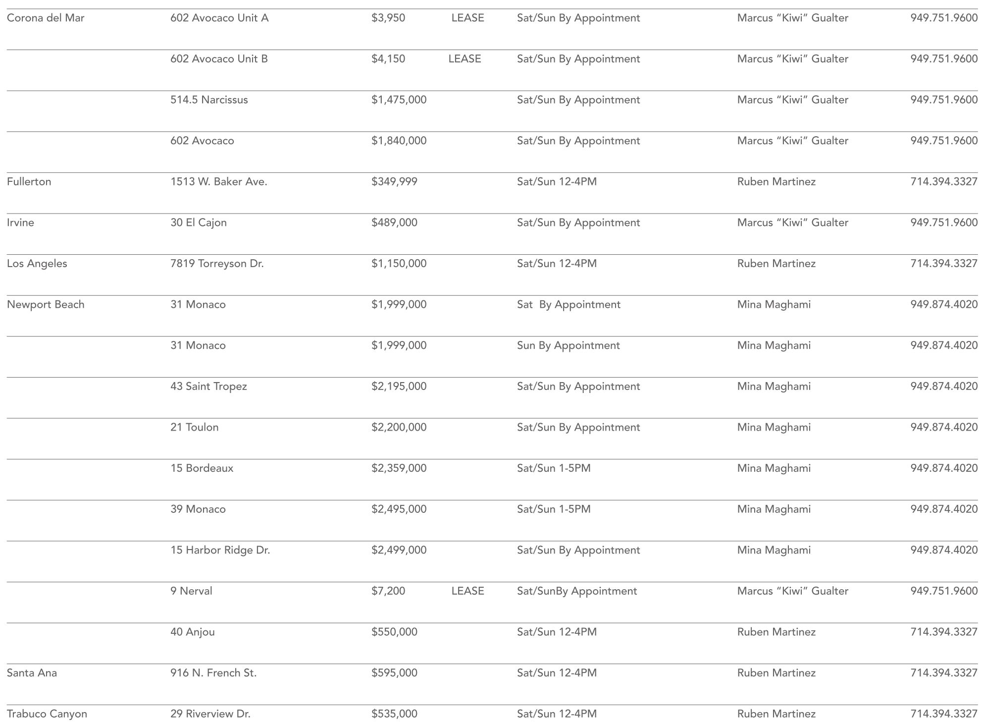 602 Avocaco $1,840,000 Sat/Sun By Appointment Marcus “Kiwi” Gualter 949.751.9600