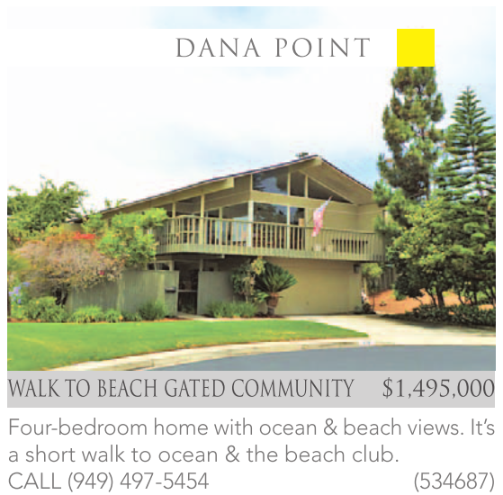 WALK TO BEACH GATED COMMUNITY $1,495,000 Four-bedroom home with ocean & beach views. It’s a short walk to ocean & the beach club. CALL (949) 497-5454 (534687)