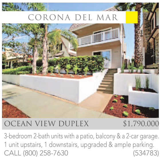 OCEAN VIEW DUPLEX $1,790,000 3-bedroom 2-bath units with a patio, balcony & a 2-car garage. 1 unit upstairs, 1 downstairs, upgraded & ample parking. CALL (800) 258-7630 (534783)