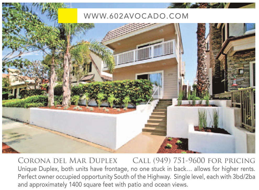 Corona del Mar Duplex Call (949) 751-9600 for pricing Unique Duplex, both units have frontage, no one stuck in back… allows for higher rents. Perfect owner occupied opportunity South of the Highway. Single level, each with 3bd/2ba and approximately 1400 square feet with patio and ocean views.