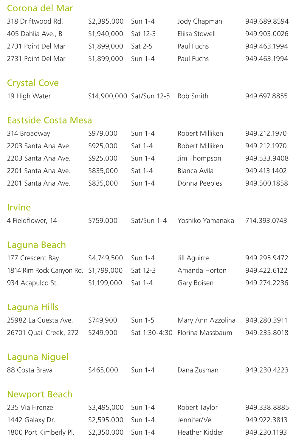 2201 Santa Ana Ave. $835,000 Sun 1-4 Donna Peebles 949.500.1858