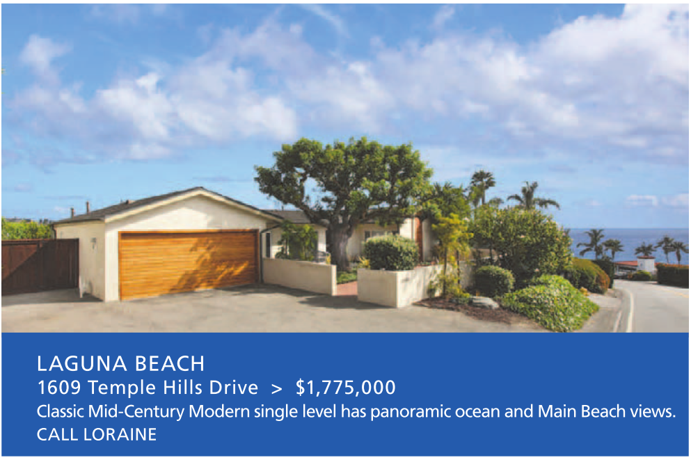 LAGUNA BEACH 1609 Temple Hills Drive > $1,775,000 Classic Mid-Century Modern single level has panoramic ocean and Main Beach views. CALL LORAINE