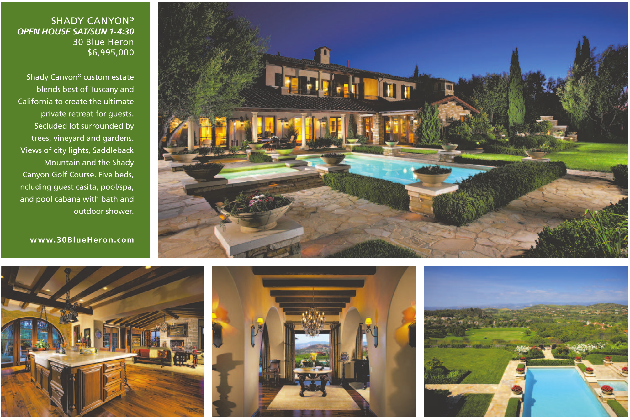 SHADY CANYON ® OPEN HOUSE SAT/SUN 1-4:30 30 Blue Heron $6,995,000 Shady Canyon ® custom estate blends best of Tuscany and California to create the ultimate private retreat for guests. Secluded lot surrounded by trees, vineyard and gardens. Views of city lights, Saddleback Mountain and the Shady Canyon Golf Course. Five beds, including guest casita, pool/spa, and pool cabana with bath and outdoor shower. www.30BlueHeron.com