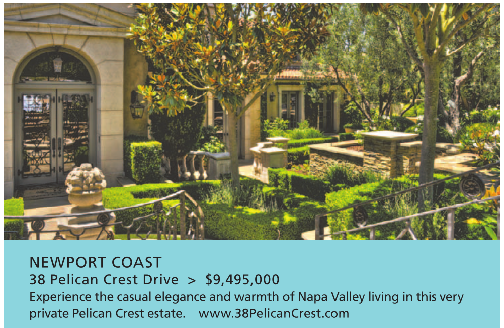 NEWPORT COAST 38 Pelican Crest Drive > $9,495,000 Experience the casual elegance and warmth of Napa Valley living in this very private Pelican Crest estate. www.38PelicanCrest.com