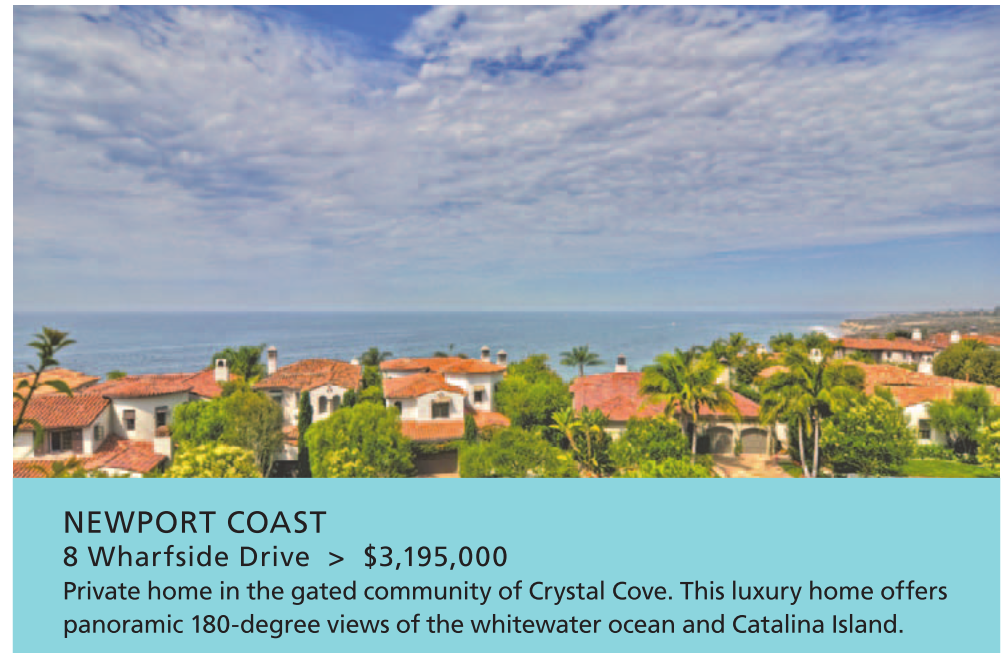 NEWPORT COAST 8 Wharfside Drive > $3,195,000 Private home in the gated community of Crystal Cove. This luxury home offers panoramic 180-degree views of the whitewater ocean and Catalina Island.