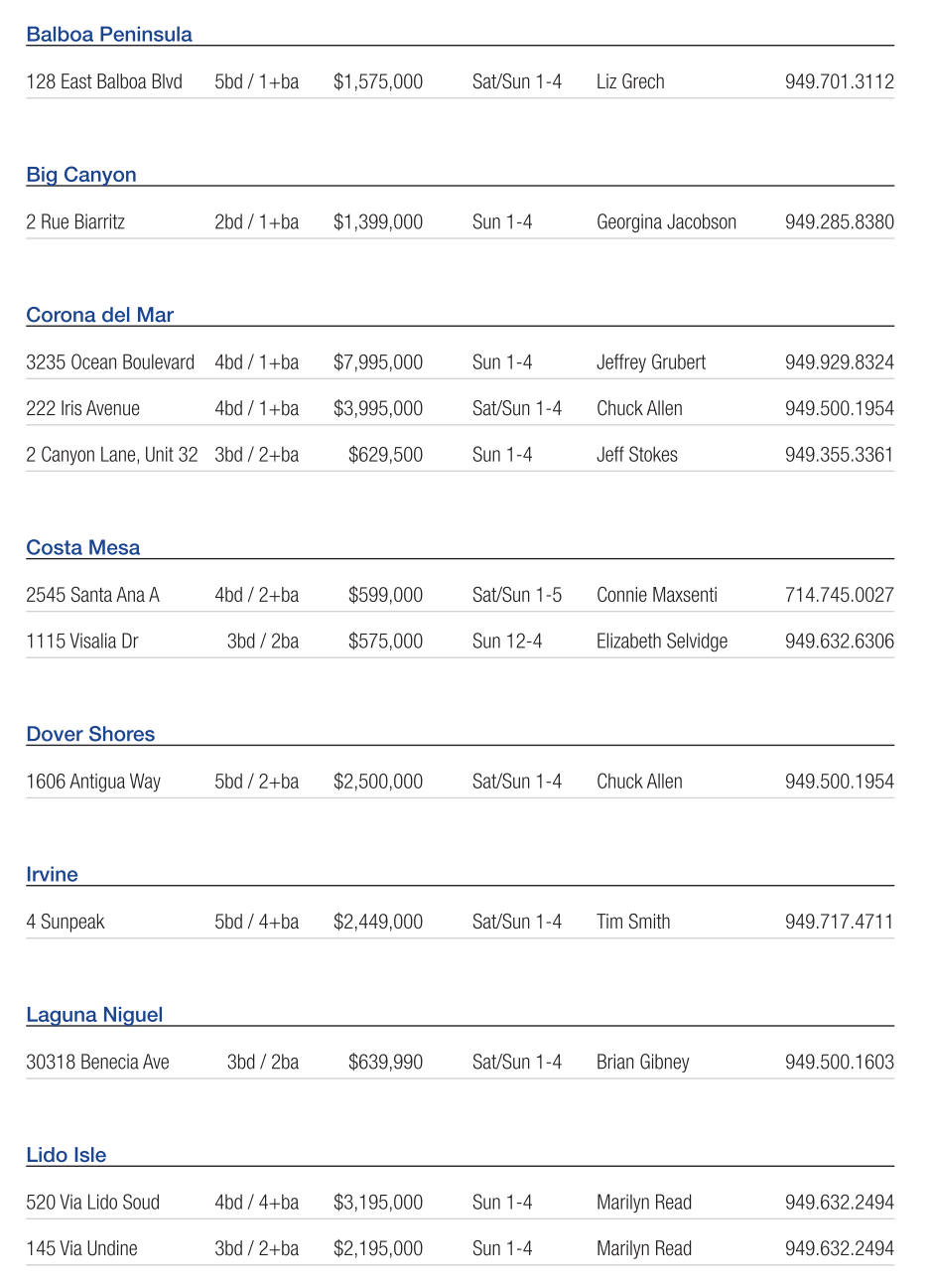 Corona del Mar 3235 Ocean Boulevard 4bd / 1+ba $7,995,000 Sun 1-4 Jeffrey Grubert 949.929.8324 222 Iris Avenue 4bd / 1+ba $3,995,000 Sat/Sun 1-4 Chuck Allen 949.500.1954 2 Canyon Lane, Unit 32 3bd / 2+ba $629,500 Sun 1-4 Jeff Stokes 949.355.3361