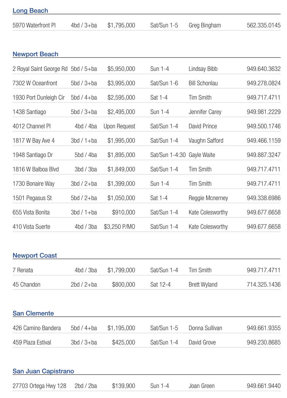 1930 Port Dunleigh Cir 5bd / 4+ba $2,595,000 Sat 1-4 Tim Smith 949.717.4711 1438 Santiago 5bd / 3+ba $2,495,000 Sun 1-4 Jennifer Carey 949.981.2229 4012 Channel Pl 4bd / 4ba Upon Request Sat/Sun 1-4 David Prince 949.500.1746 1817 W Bay Ave 4 3bd / 1+ba $1,995,000 Sat/Sun 1-4 Vaughn Safford 949.466.1159 1948 Santiago Dr 5bd / 4ba $1,895,000 Sat/Sun 1-4:30 Gayle Waite 949.887.3247 1816 W Balboa Blvd 3bd / 3ba $1,849,000 Sat/Sun 1-4 Tim Smith 949.717.4711 1730 Bonaire Way 3bd / 2+ba $1,399,000 Sun 1-4 Tim Smith 949.717.4711 1501 Pegasus St 5bd / 2+ba $1,050,000 Sat 1-4 Reggie Mcnerney 949.338.6986 655 Vista Bonita 3bd / 1+ba $910,000 Sat/Sun 1-4 Kate Colesworthy 949.677.6658 410 Vista Suerte 4bd / 3ba $3,250 P/MO Sat/Sun 1-4 Kate Colesworthy 949.677.6658