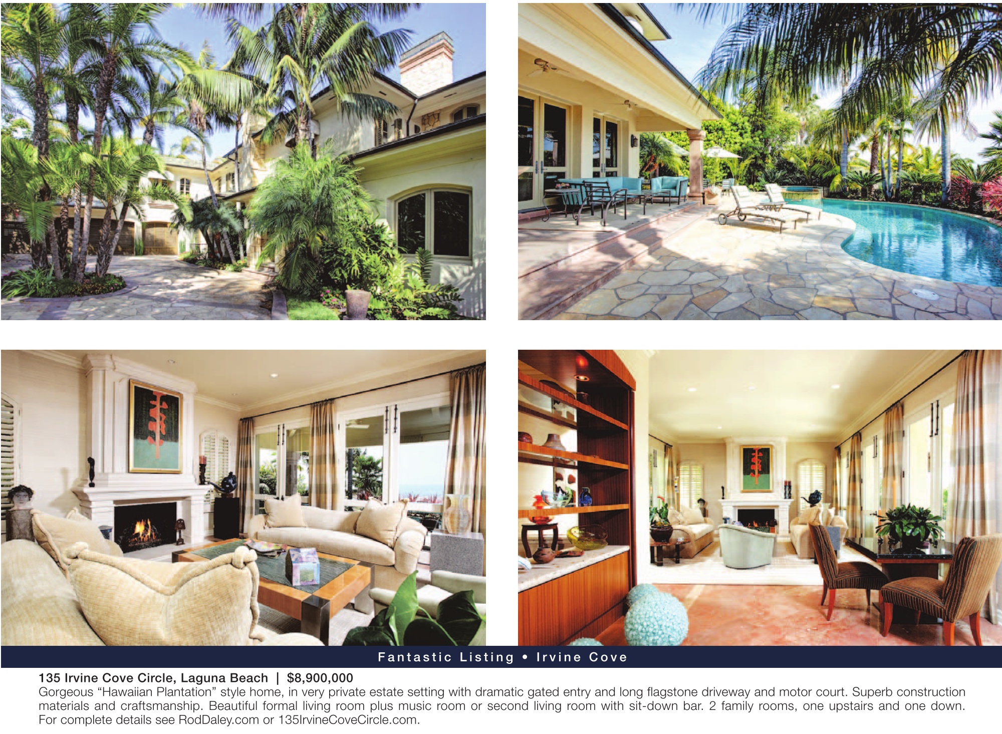 135 Irvine Cove Circle, Laguna Beach | $8,900,000 Gorgeous “Hawaiian Plantation” style home, in very private estate setting with dramatic gated entry and long flagstone driveway and motor court. Superb construction materials and craftsmanship. Beautiful formal living room plus music room or second living room with sit-down bar. 2 family rooms, one upstairs and one down. For complete details see RodDaley.com or 135IrvineCoveCircle.com.