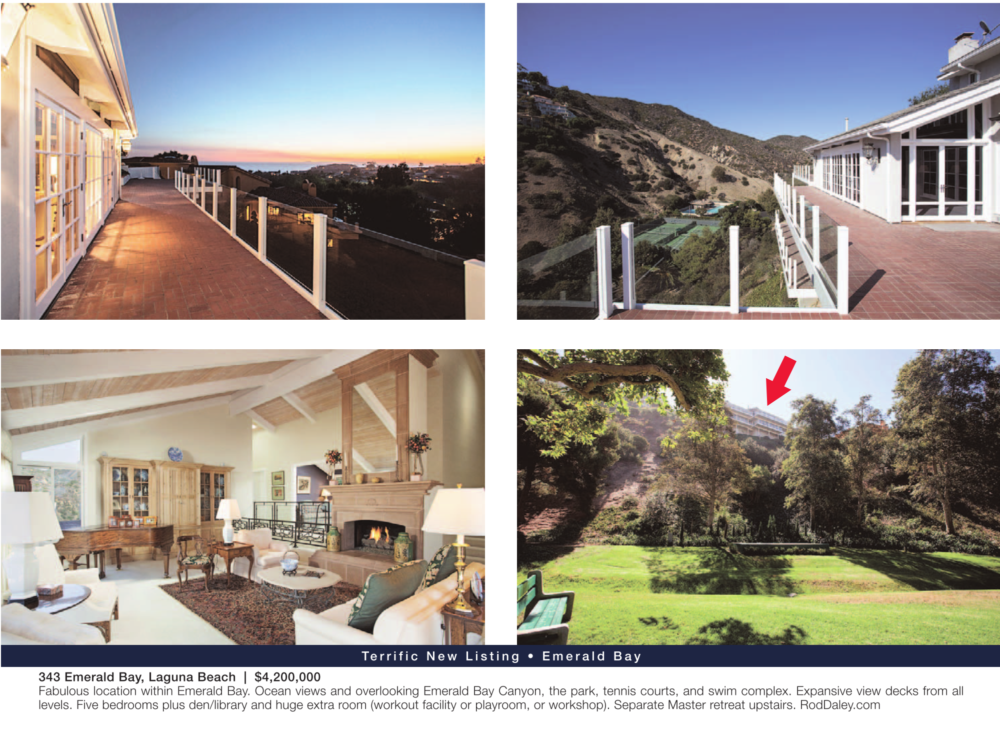 343 Emerald Bay, Laguna Beach | $4,200,000 Fabulous location within Emerald Bay. Ocean views and overlooking Emerald Bay Canyon, the park, tennis courts, and swim complex. Expansive view decks from all levels. Five bedrooms plus den/library and huge extra room (workout facility or playroom, or workshop). Separate Master retreat upstairs. RodDaley.com